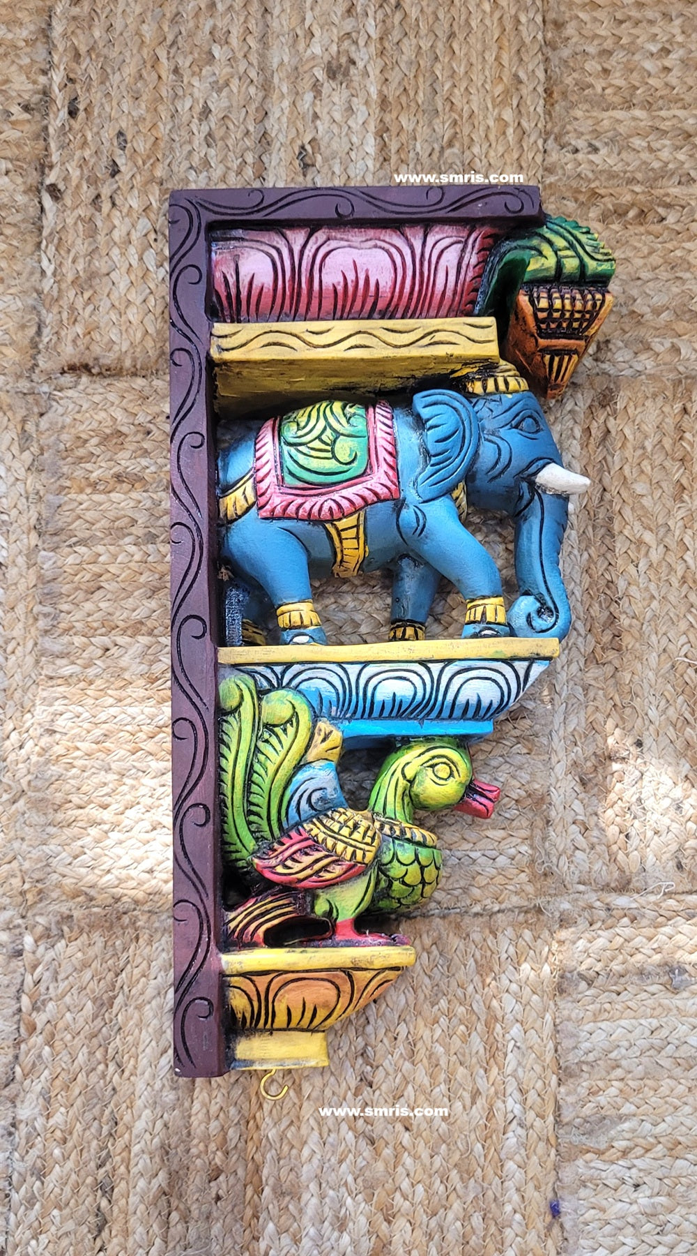 Beautifully detailed hand-carved mahogany wood bracket showcasing the iconic blue elephant and green Annam design, reflecting the richness of South Indian Chettinad craftsmanship and heritage artistry.