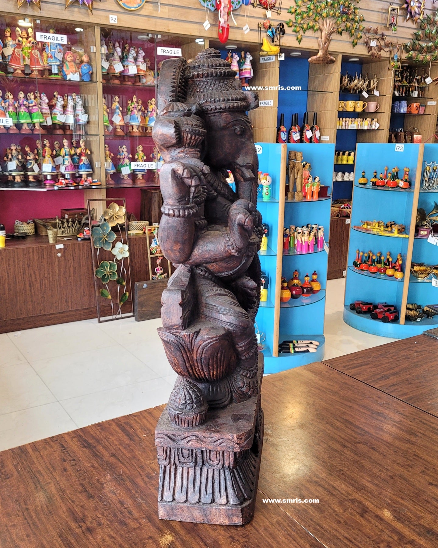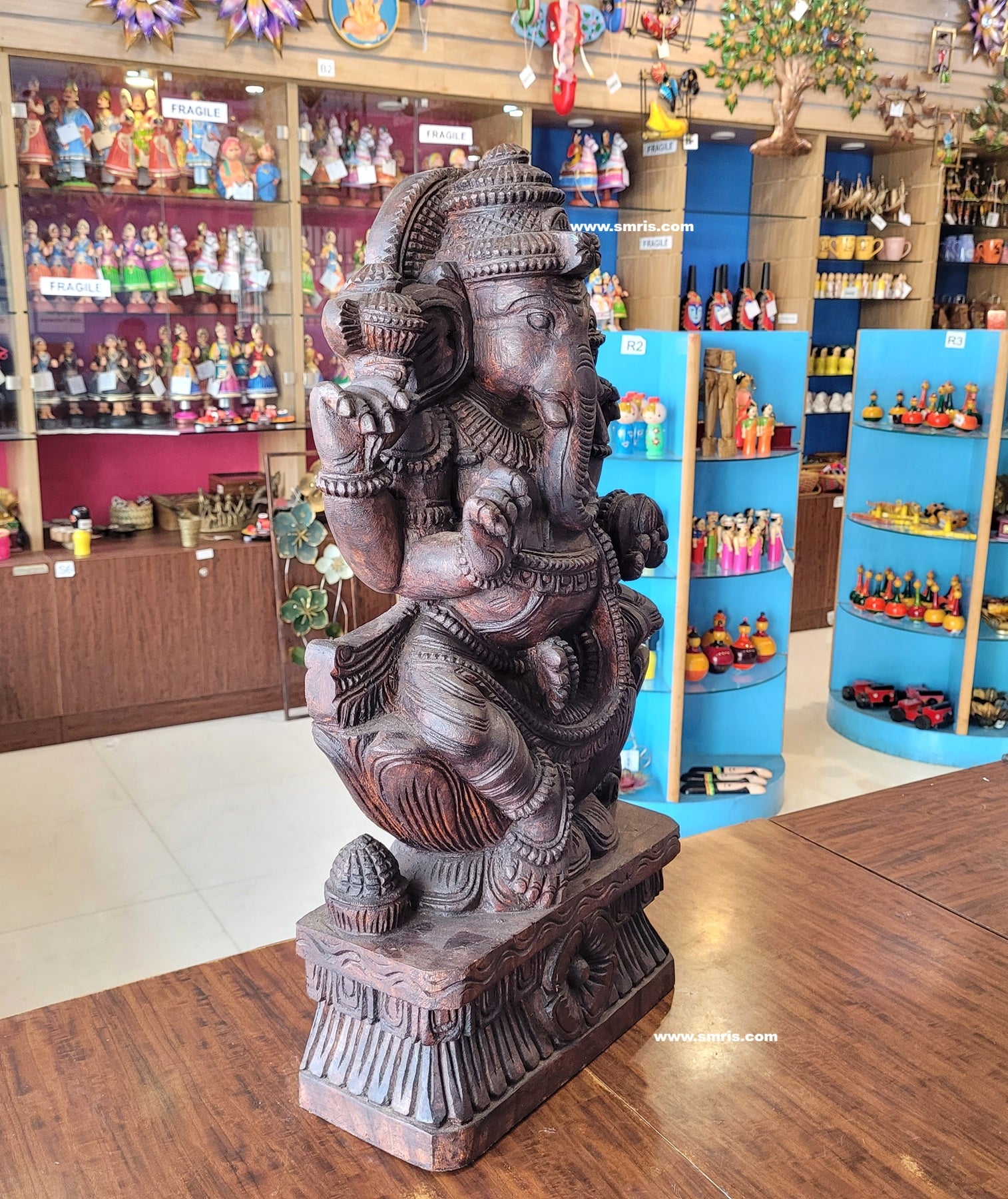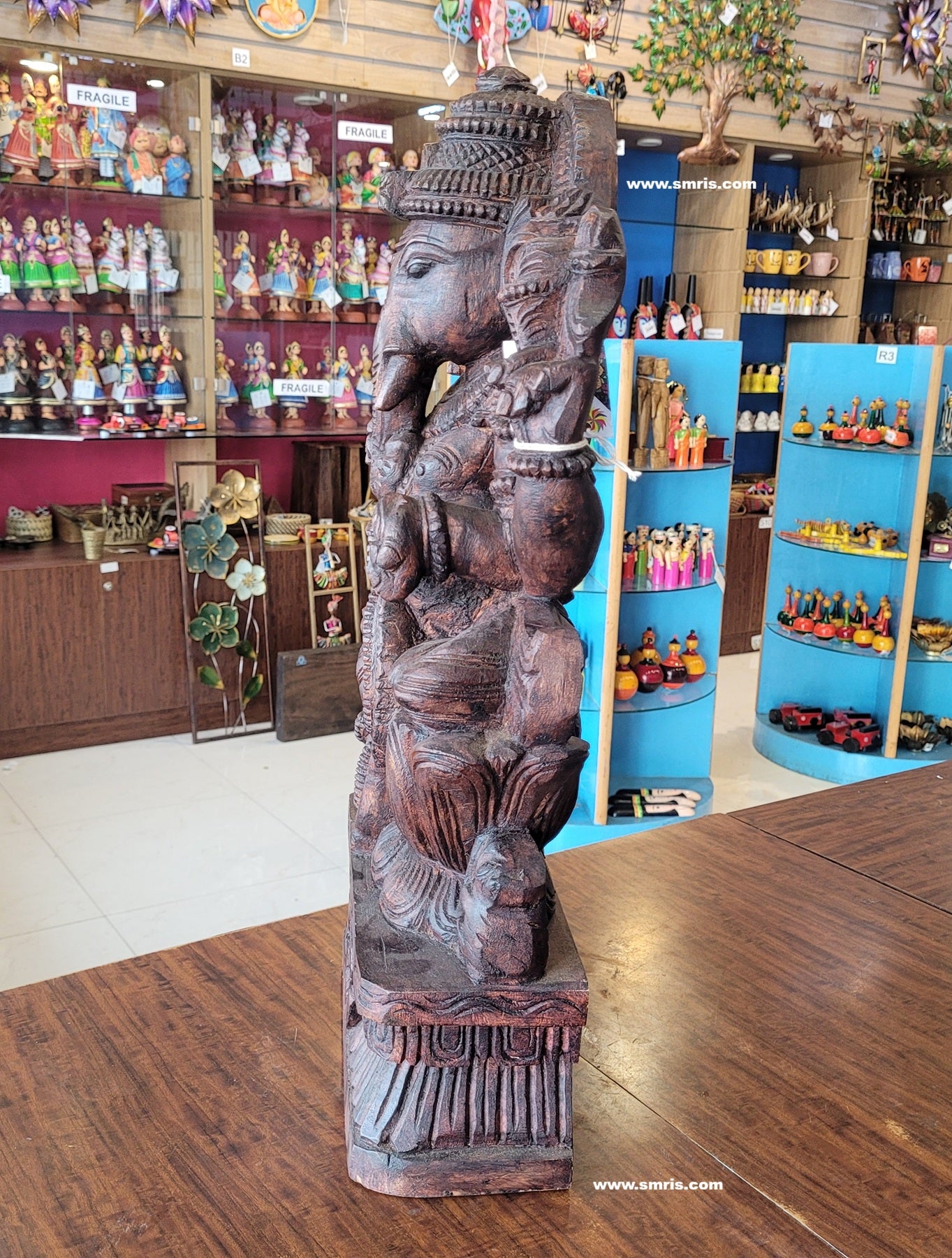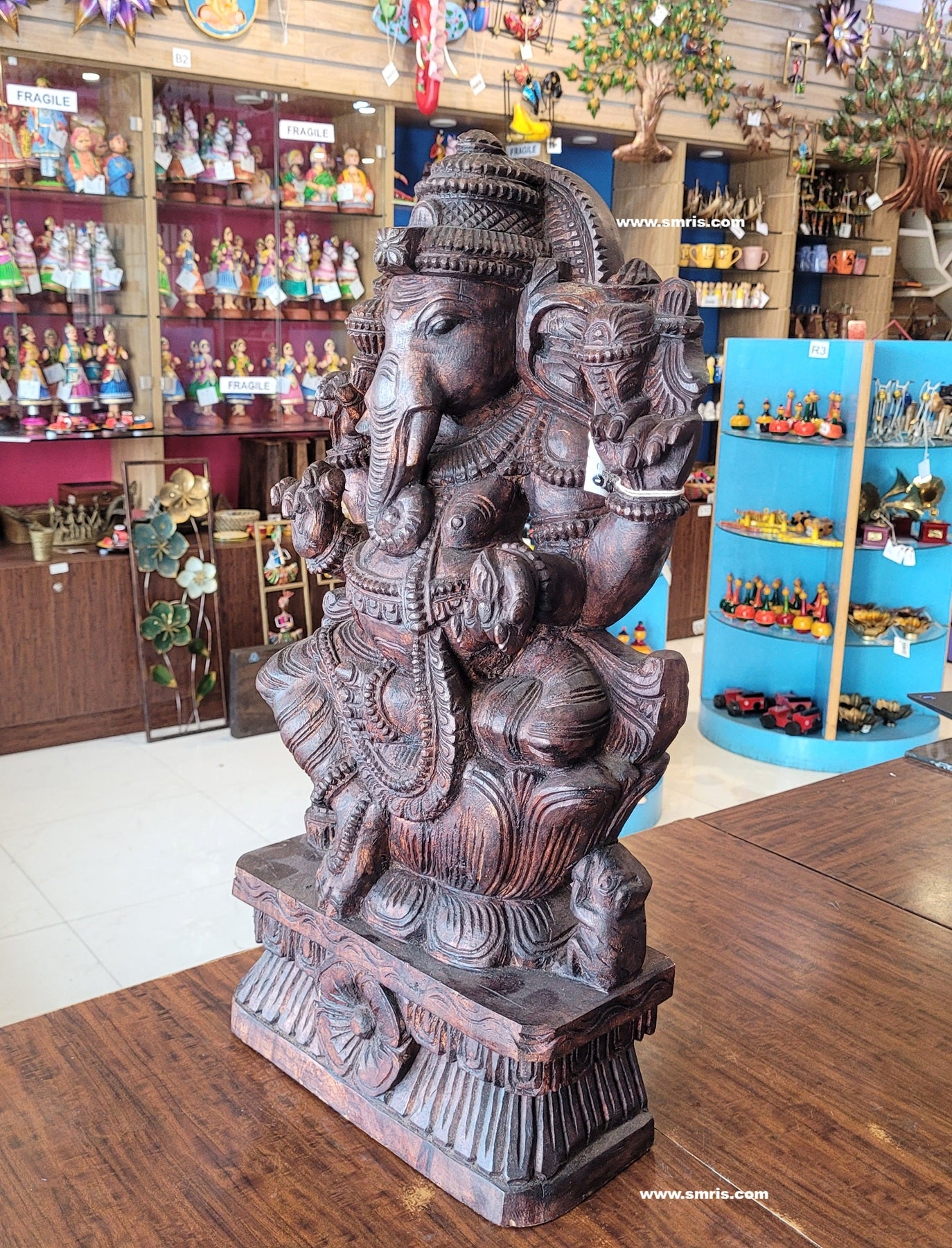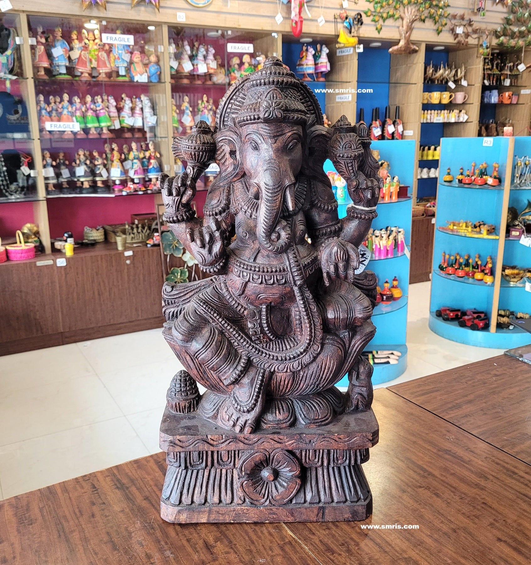 Product Overview: Exquisitely handcrafted Lord Ganesha / Vinayagar Trunk Left Side Wooden Statue – Design 5, made from premium Vaagai wood and finished in a rich rosewood colour polish.