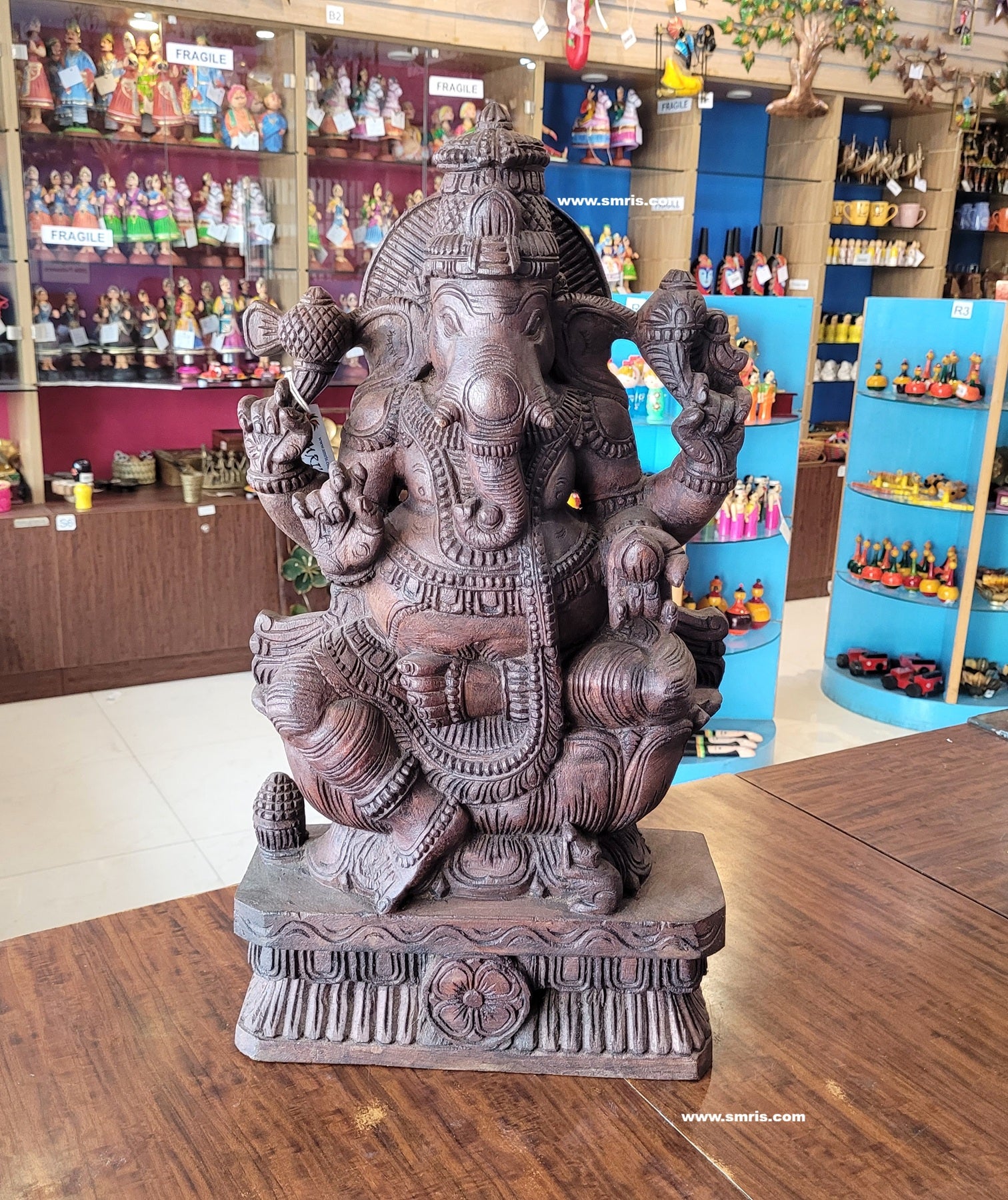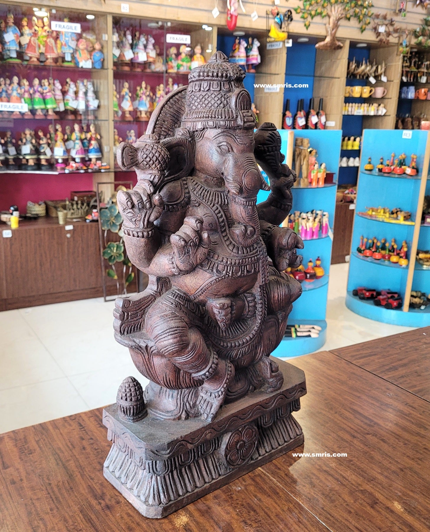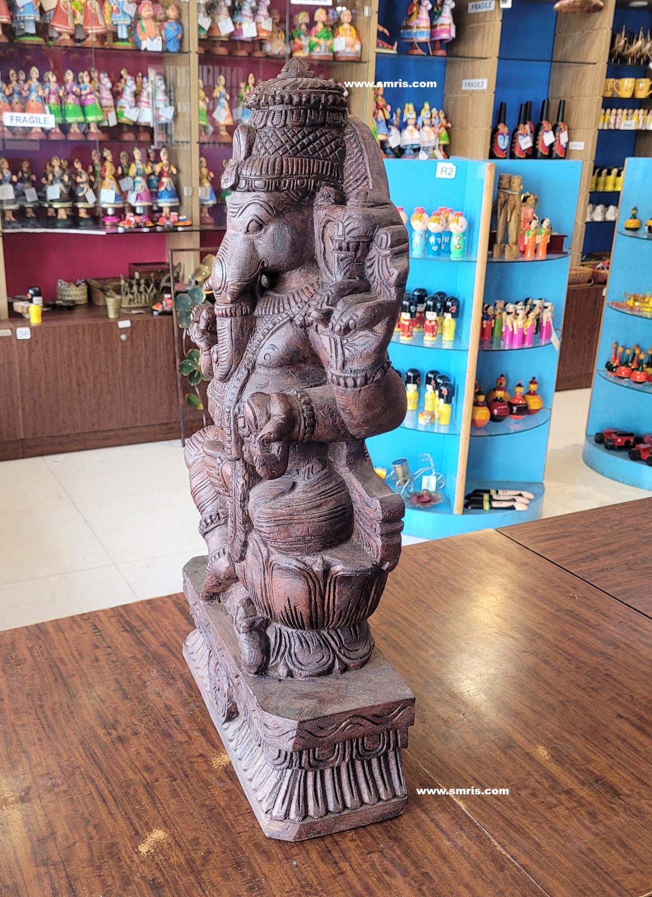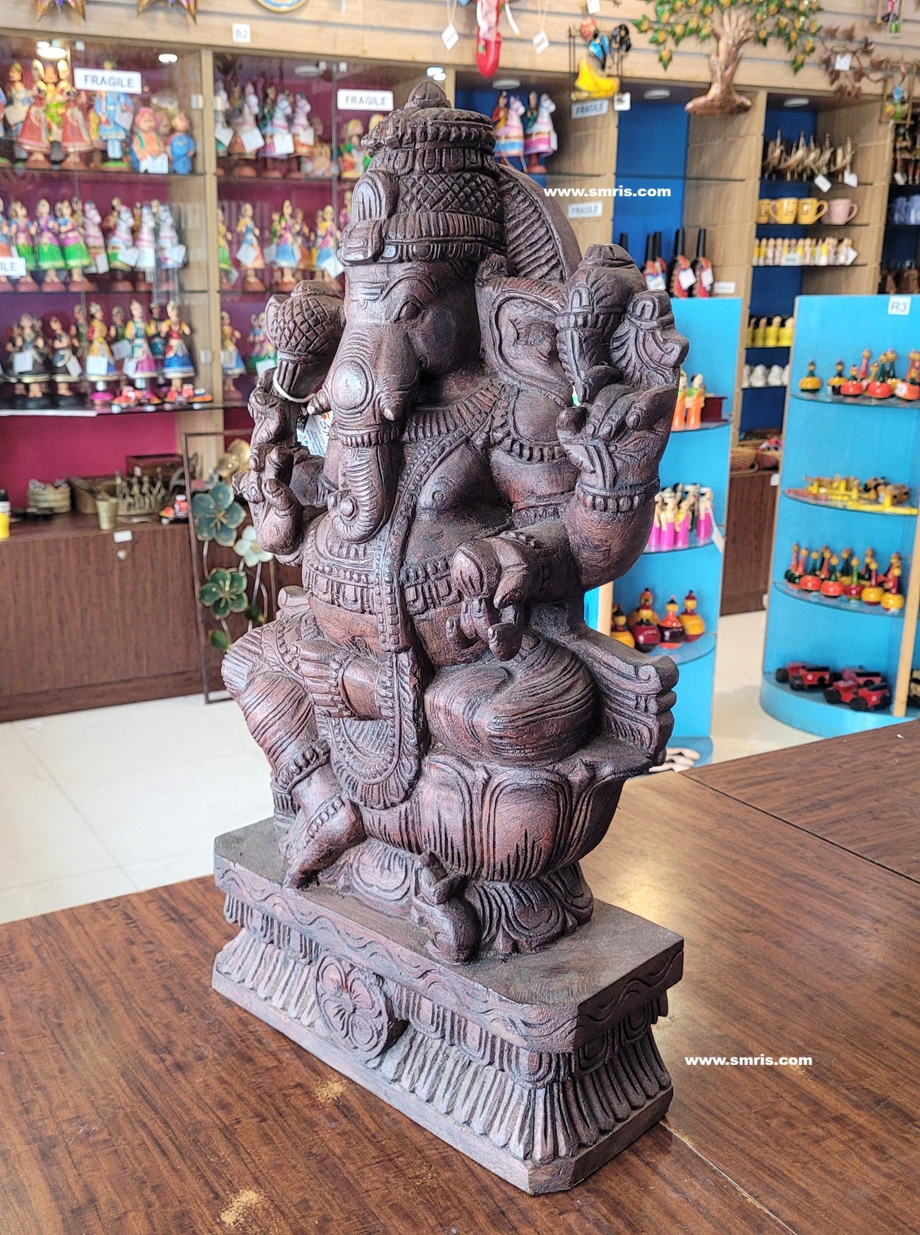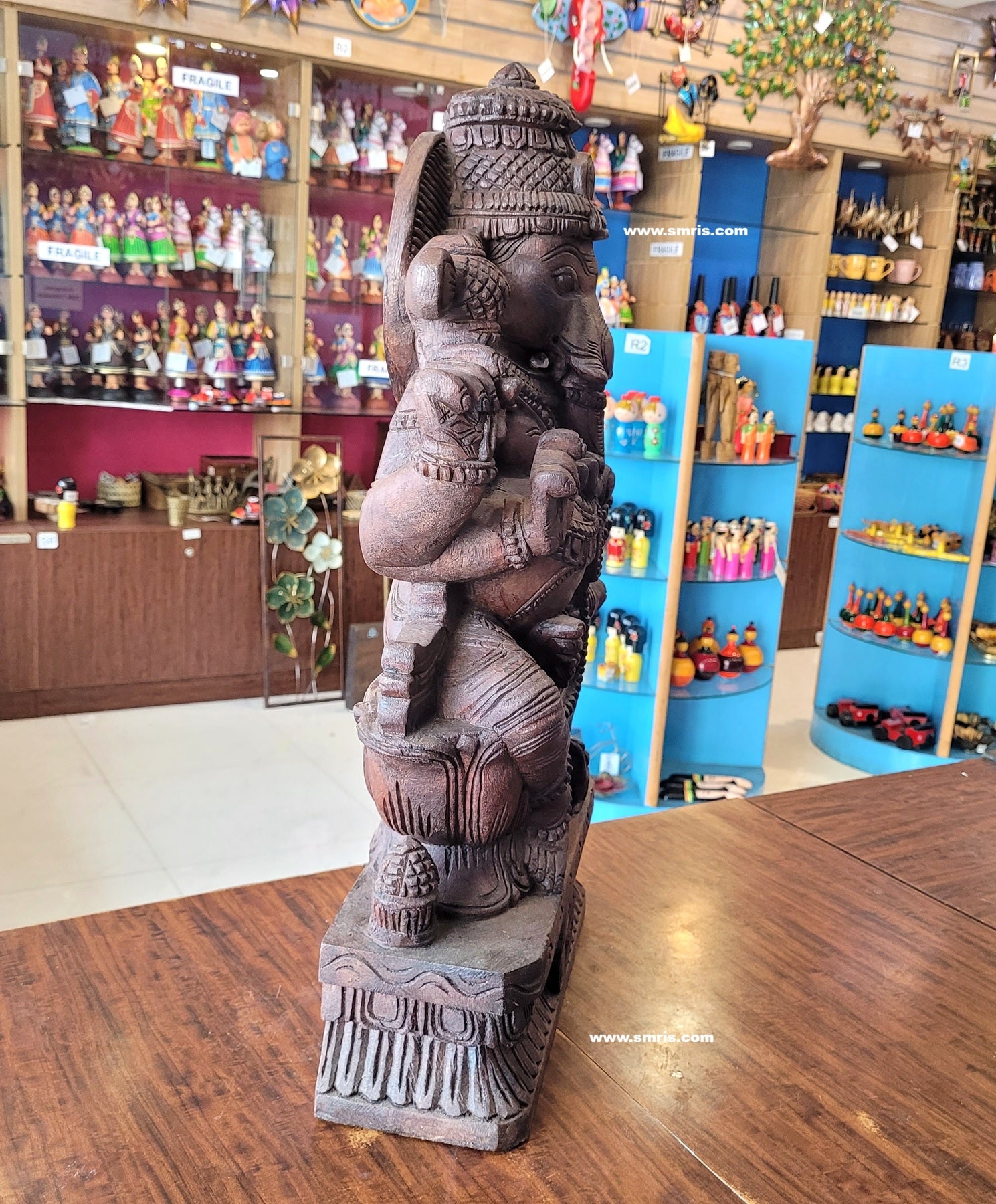 Product Overview: Elegantly handcrafted Lord Ganesha / Vinayagar Trunk Right Side Wooden Statue – Design 6, made from premium Vaagai wood and enhanced with a rich rosewood colour finish.
