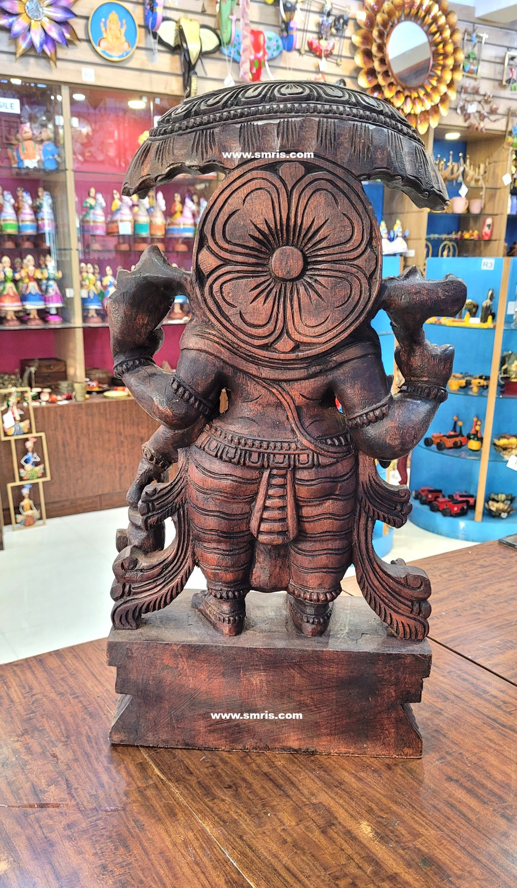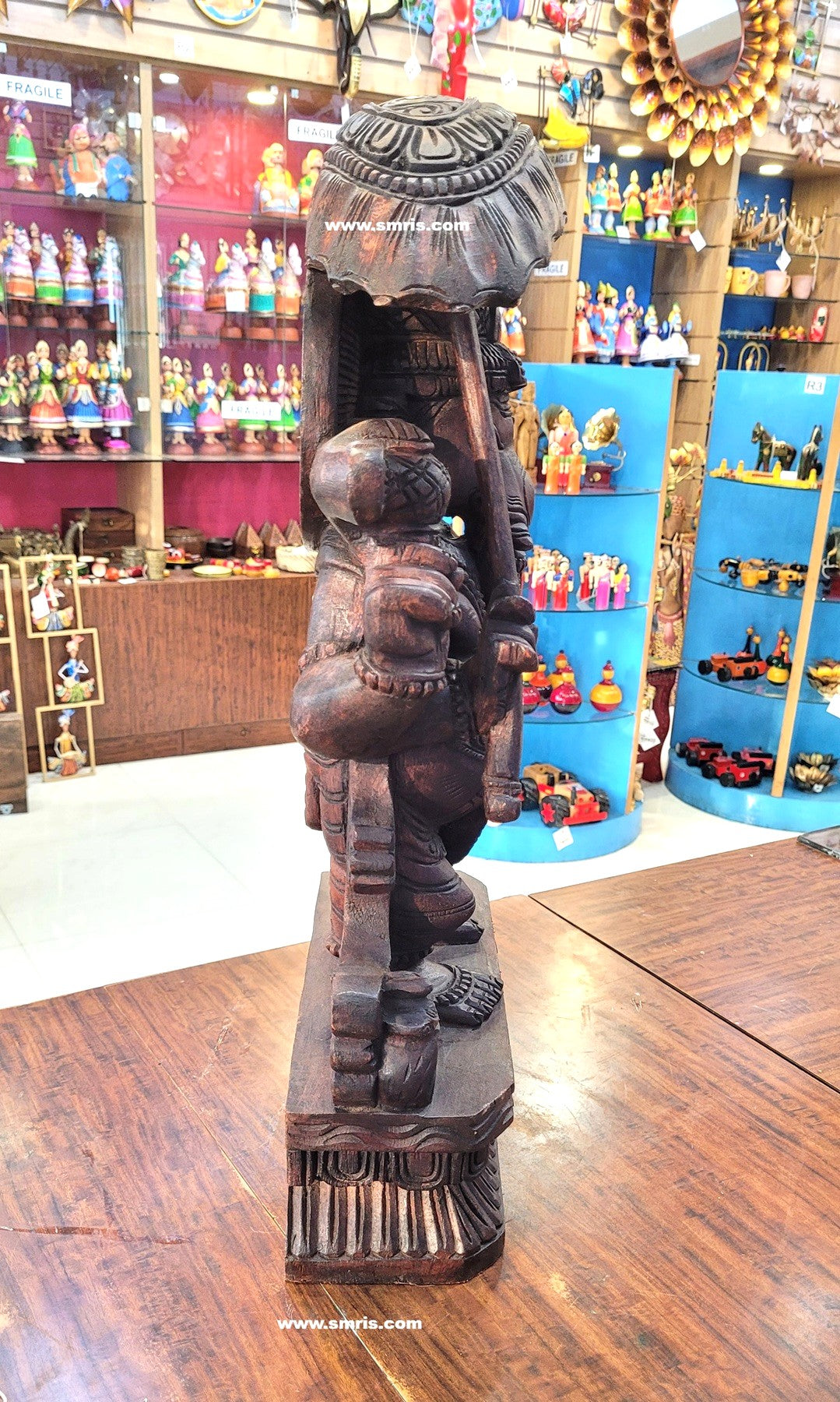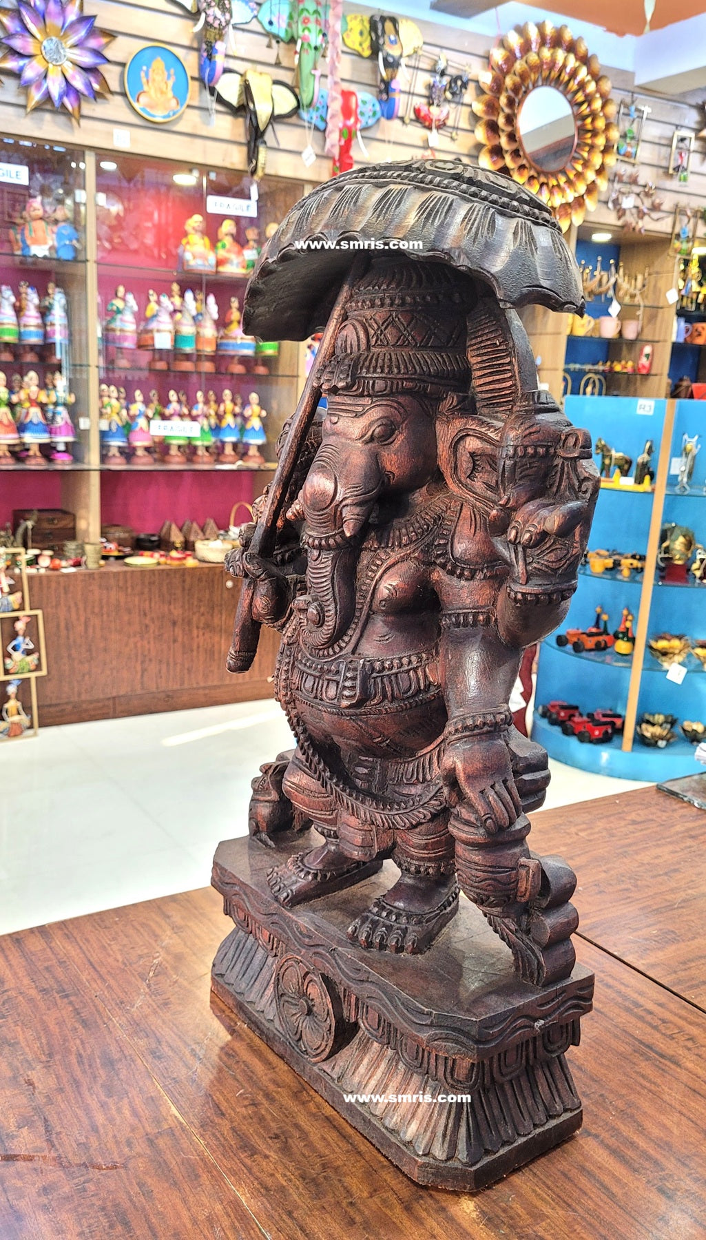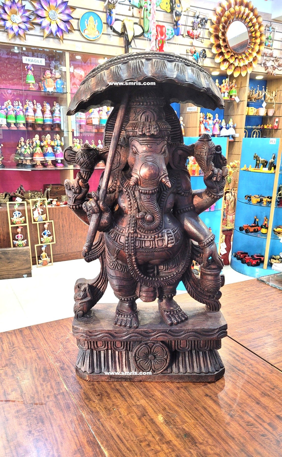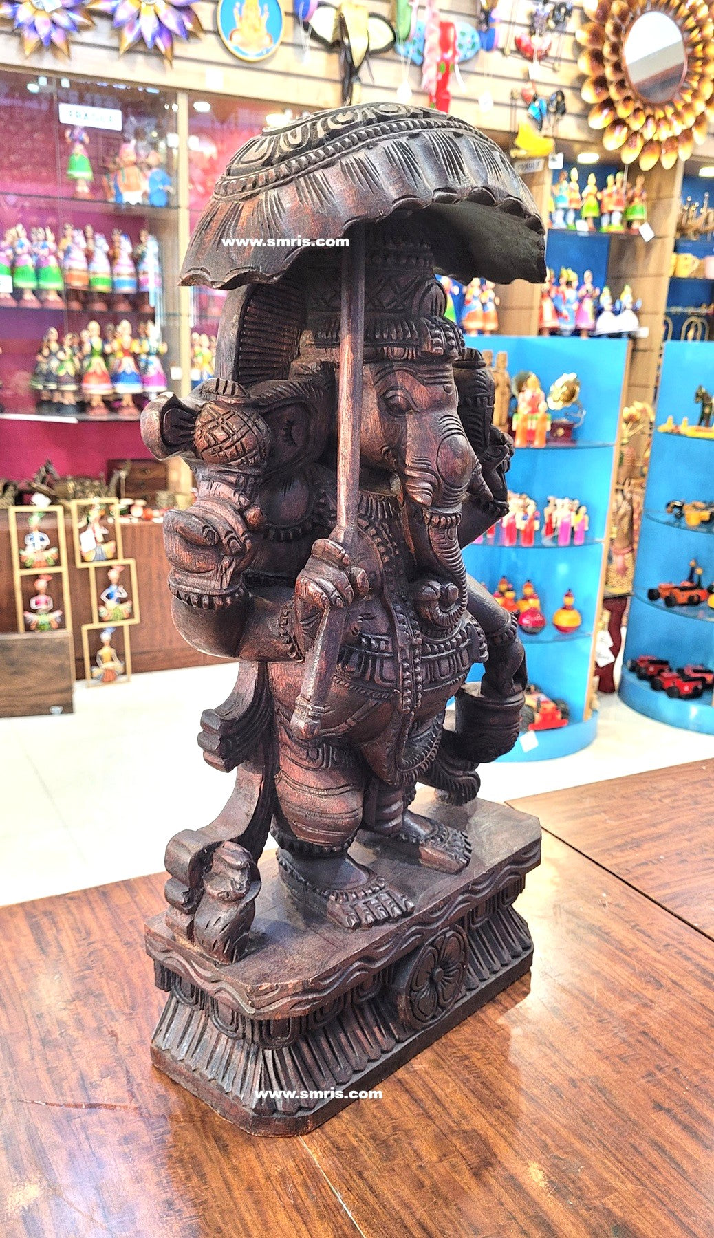 Product Overview: Exquisitely handcrafted Lord Ganesha / Vinayagar Wooden Statue Right-Side Trunk with Umbrella (Kodai) made from premium Vaagai wood and finished in an elegant rosewood polish.
