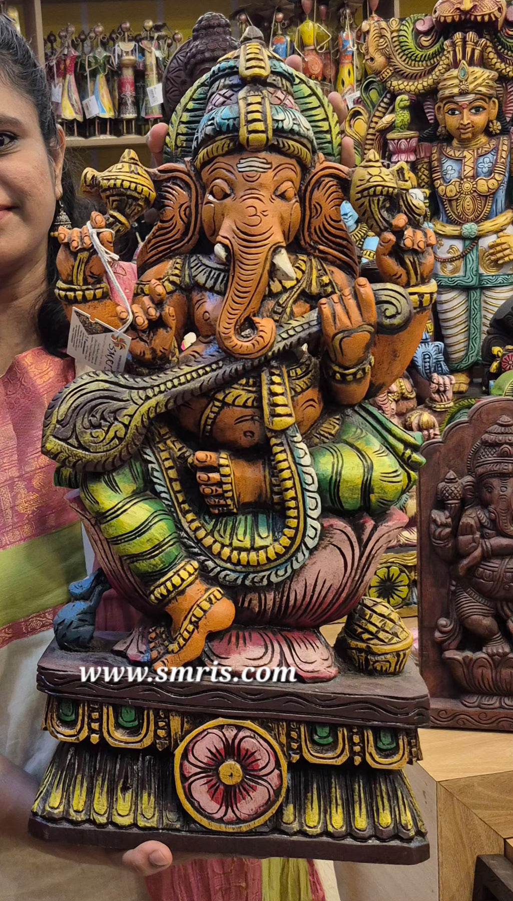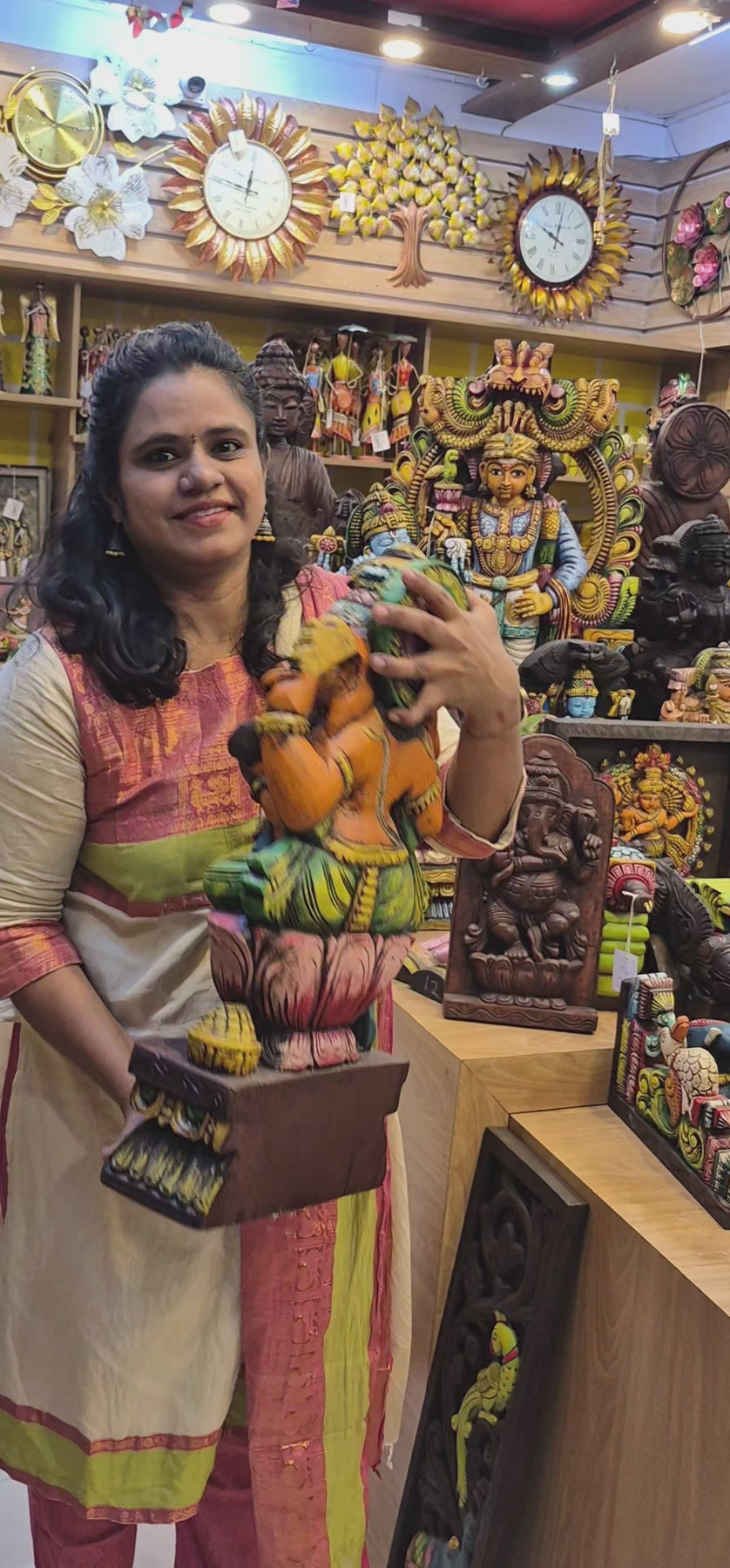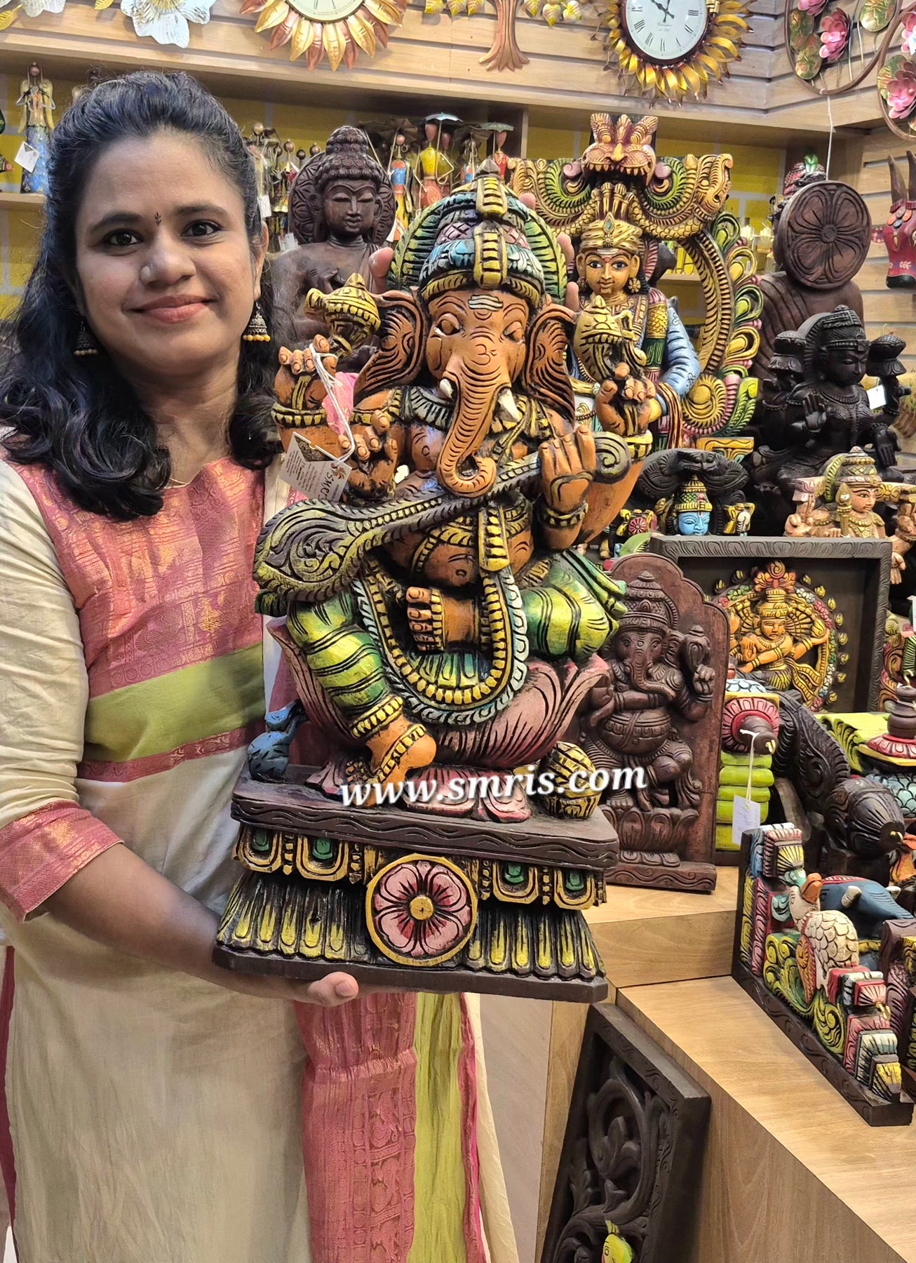 Product Overview: The Lord Ganesha / Vinayagar Trunk Left Side Wooden Statue is a handcrafted Vaagai wood idol finished in multicolor ,represents peace, prosperity, and well-being, making it ideal for home worship and auspicious beginnings.