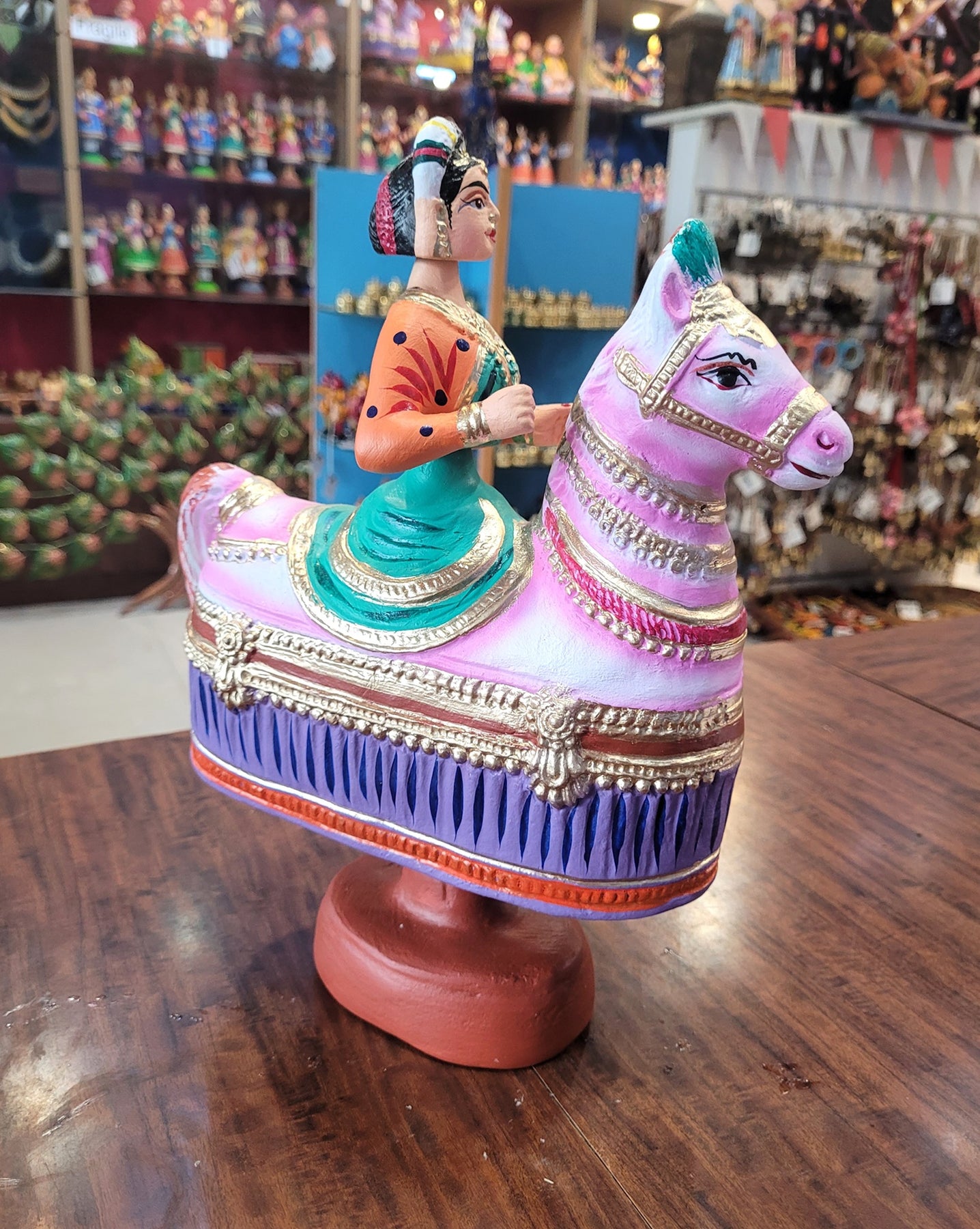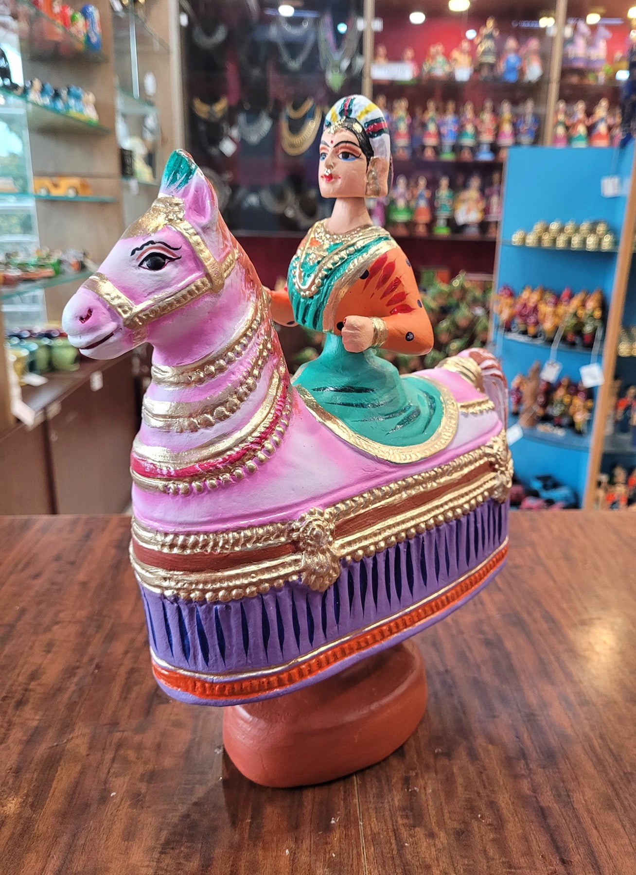 Tanjore dolls Thanjavur Thalayatti Bommai Poikkal Kuthirai Woman Green with Orange & Violet With Pink Horse dancing doll (12 H * 10 L * 4W) inches golu dolls Tamil Tradition