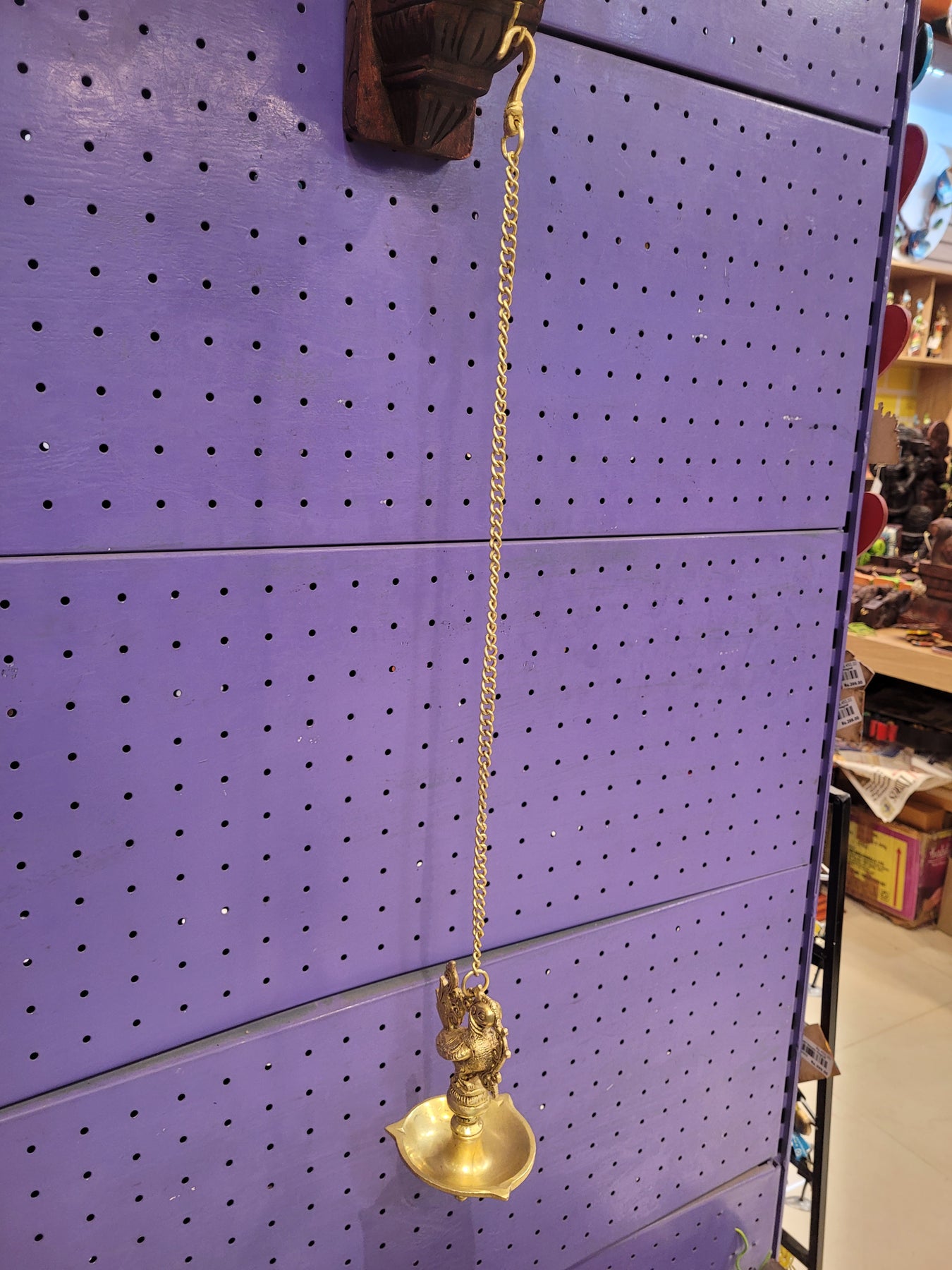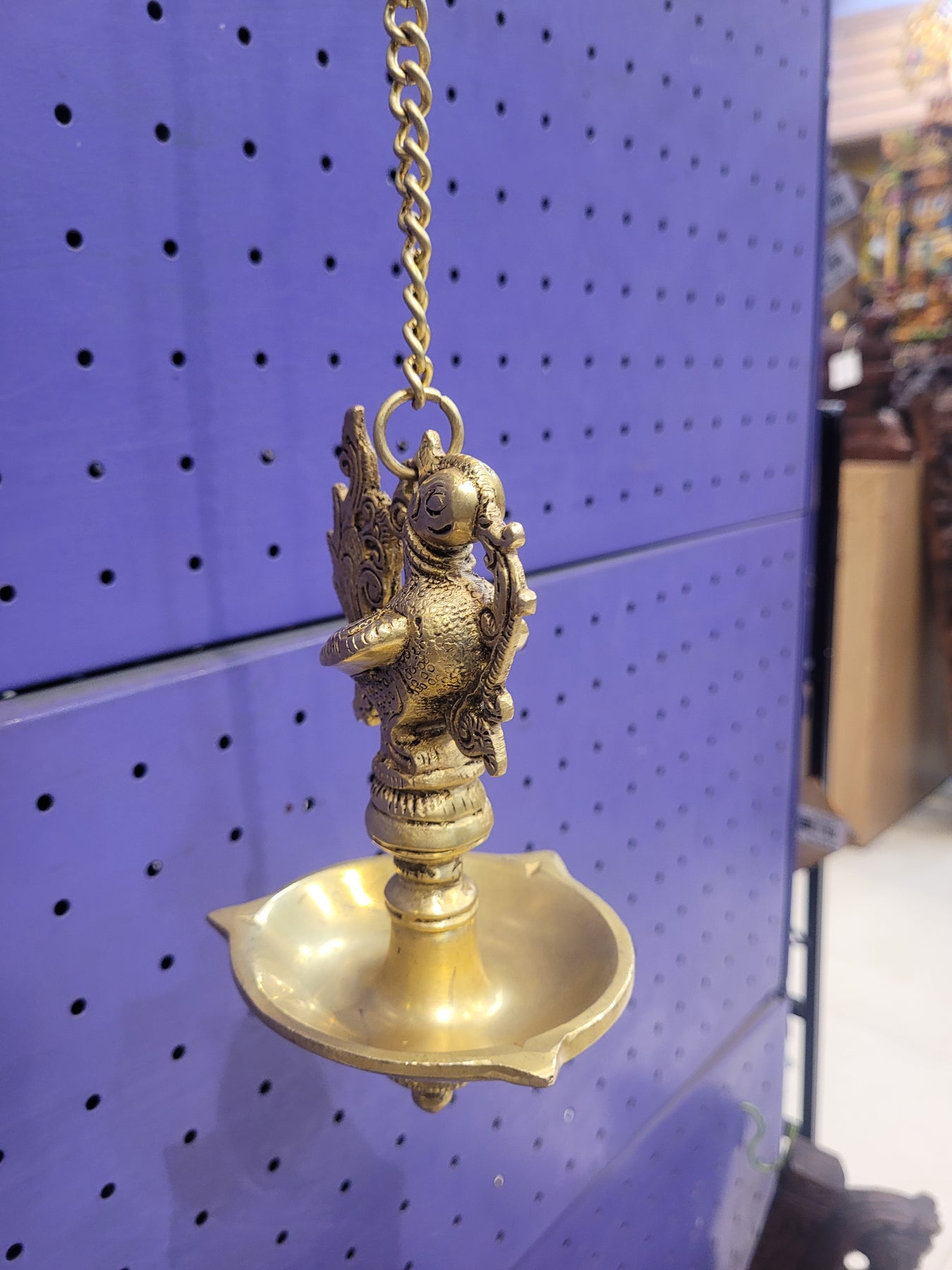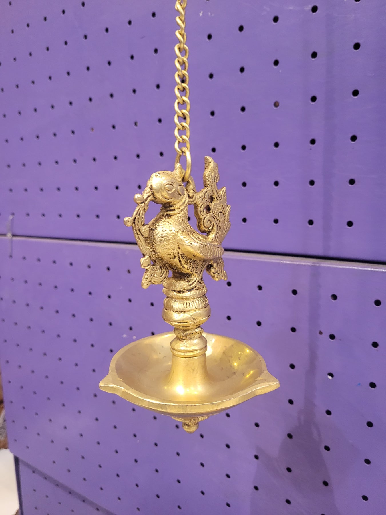Product Overview: The Brass Vilakku Hanging Diya with Chain is a traditional South Indian oil lamp designed for pooja rooms and festive décor. Featuring elegant Peacock and Annam motifs, this hanging vilakku symbolizes purity, prosperity, and divine light, making it perfect for spiritual spaces.