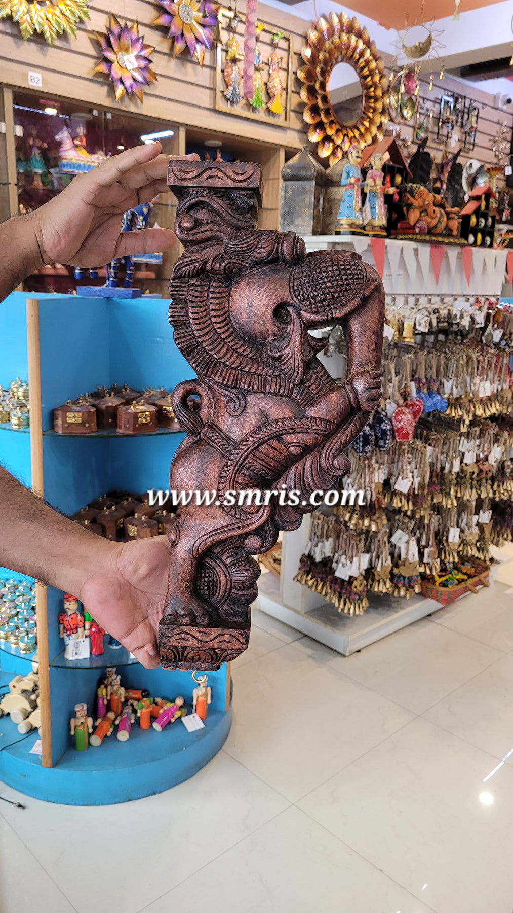 Authentic Gaja Yali wall bracket wood carving handcrafted by artisans. Traditional Chettinad wooden corbel ideal for home, temple & vastu decor.