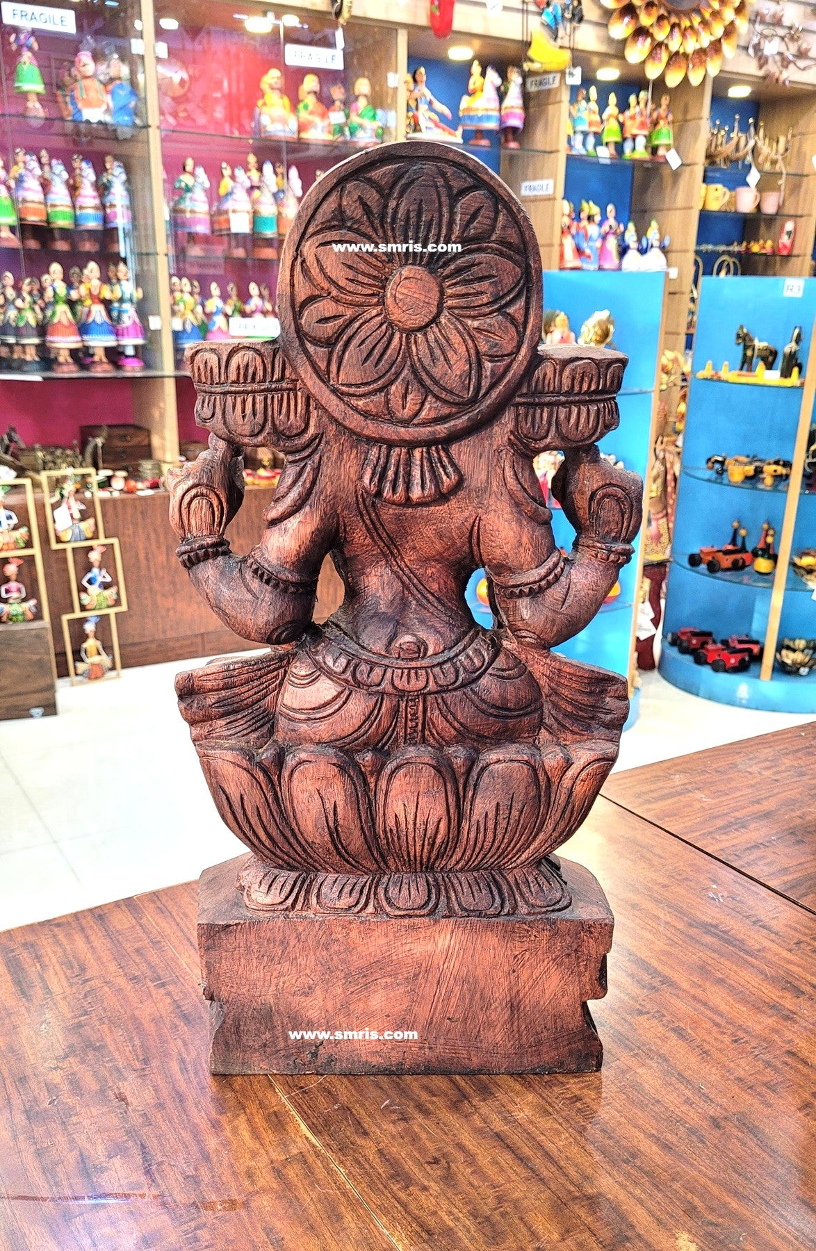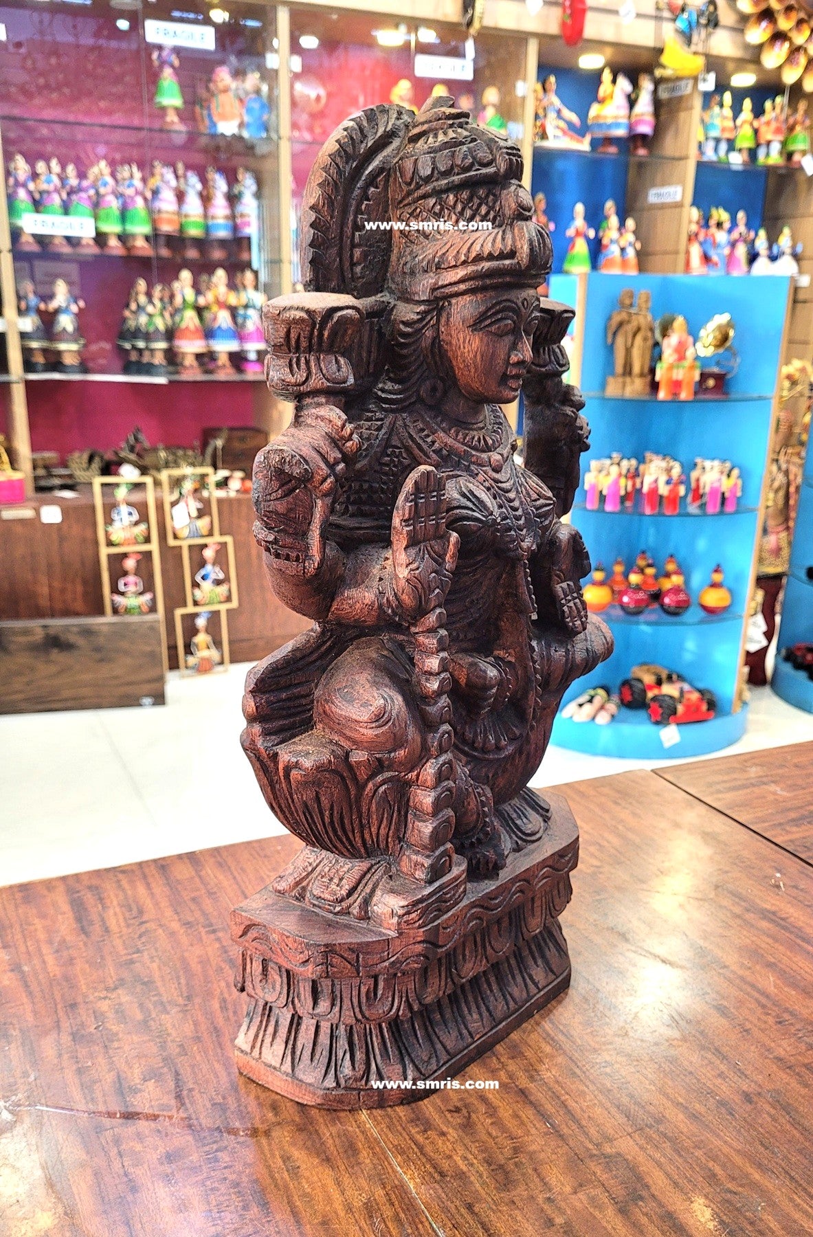 Product Overview – Beautifully handcrafted Goddess Lakshmi Wooden Statue made from premium Vaagai wood with a rich rosewood colour finish. Designed in traditional Chettinad wooden carving style, this divine sculpture symbolizes prosperity and grace, making it perfect for pooja and elegant home décor.