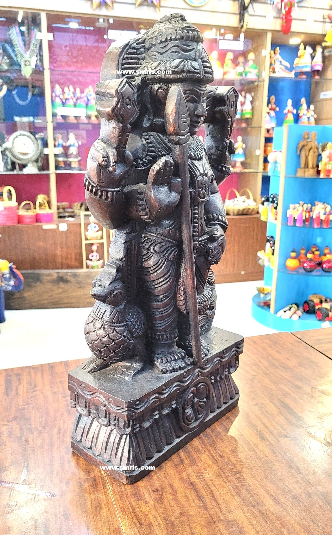 Intricately detailed Murugan idol sculpture symbolizing courage, wisdom, and victory; inspired by classic temple-style wood carving traditions of South India.