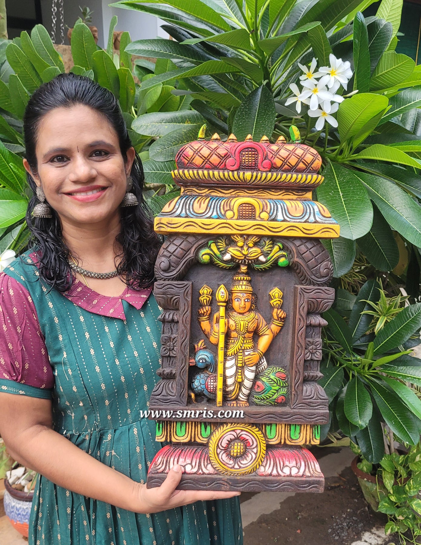 Product Overview: The Vetrivel Murugar Kavadi Wall Panel is a handcrafted mahogany wood wall hanging depicting Lord Murugan (Vel Murugar) with Peacock and Yali motifs beneath a temple-style Gopuram arch. This traditional panel symbolizes victory, courage, and divine protection, bringing positive energy and South Indian heritage into your space.