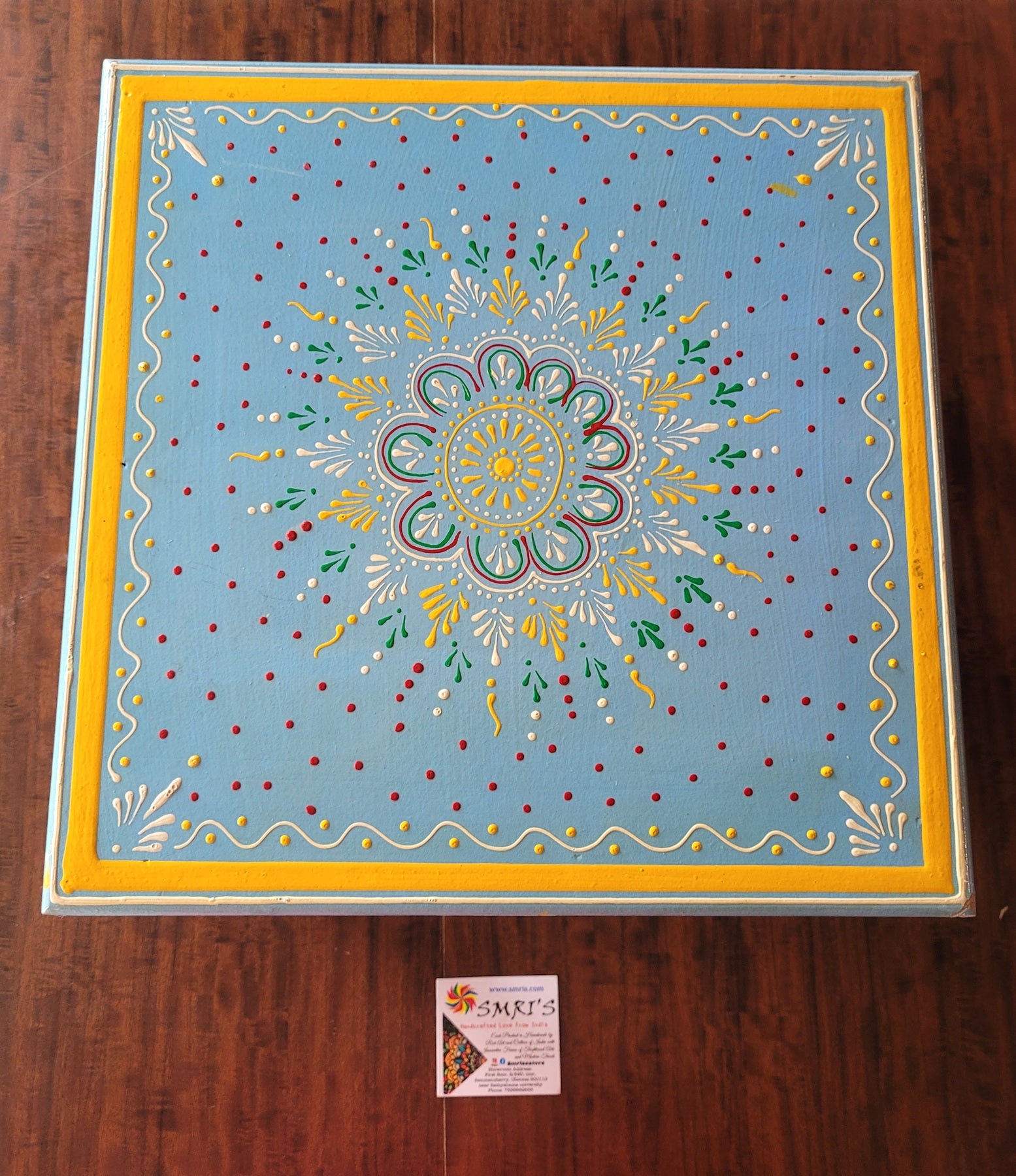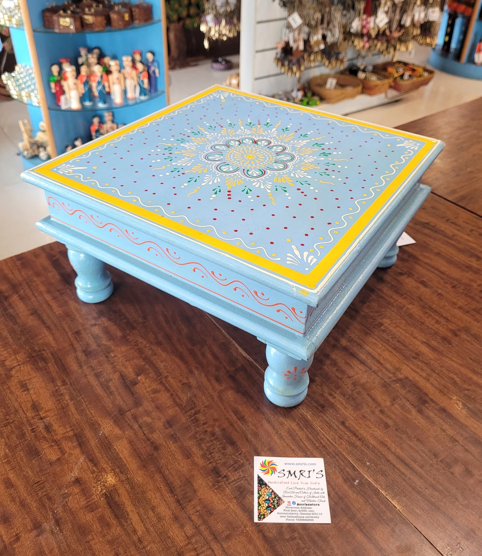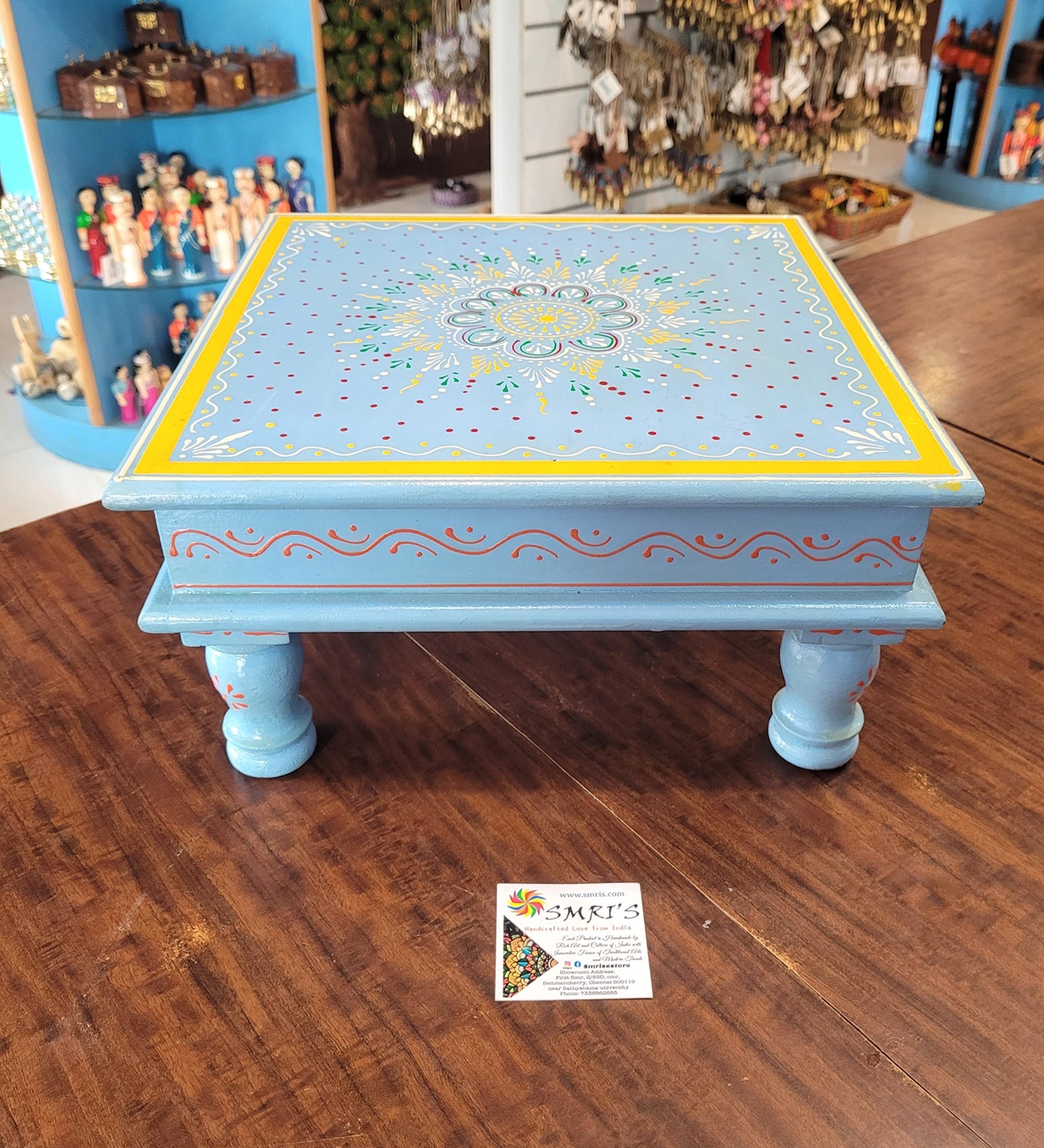 Wooden Pooja Manai Chowki Stool Sky Blue design 1