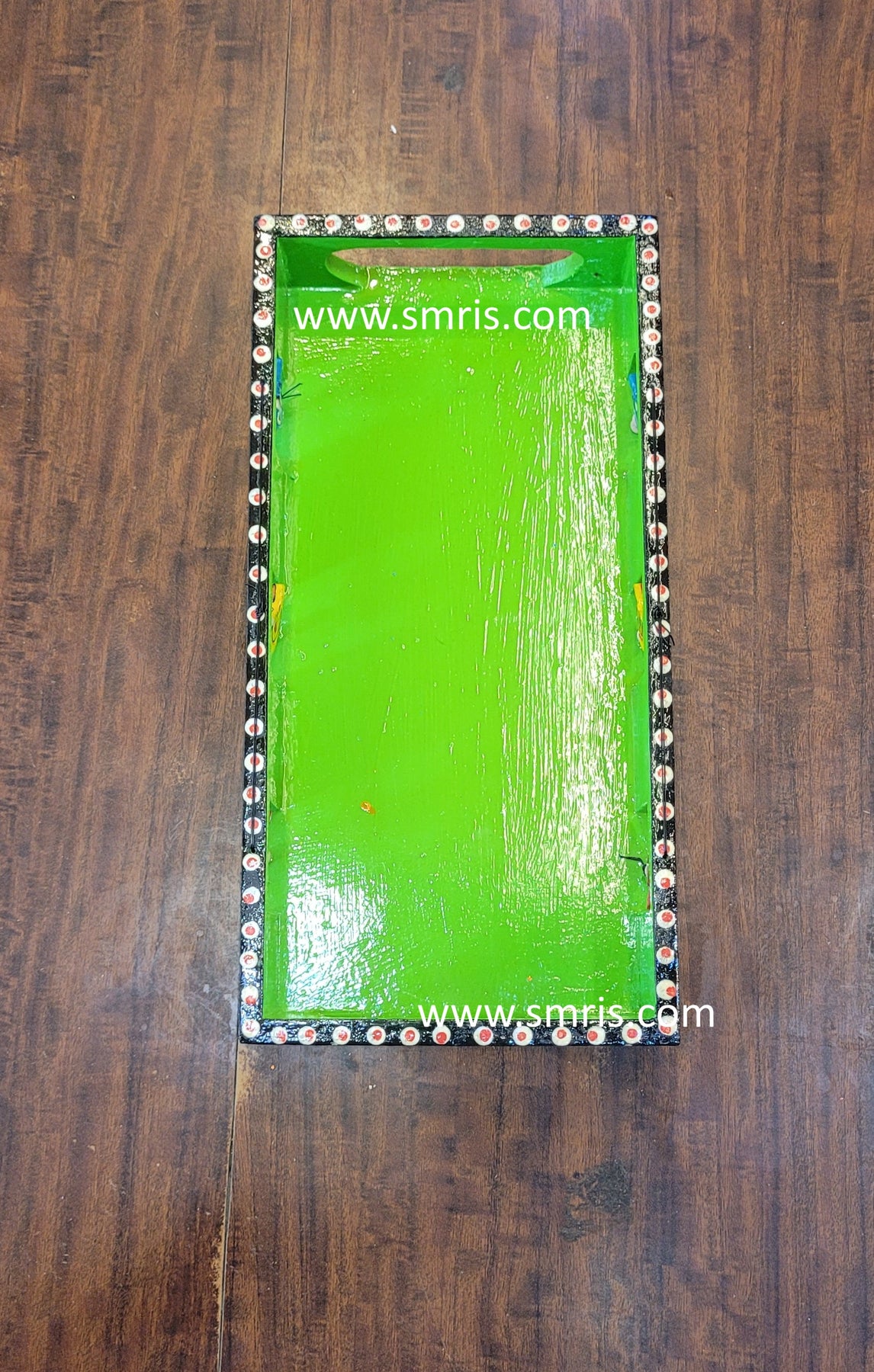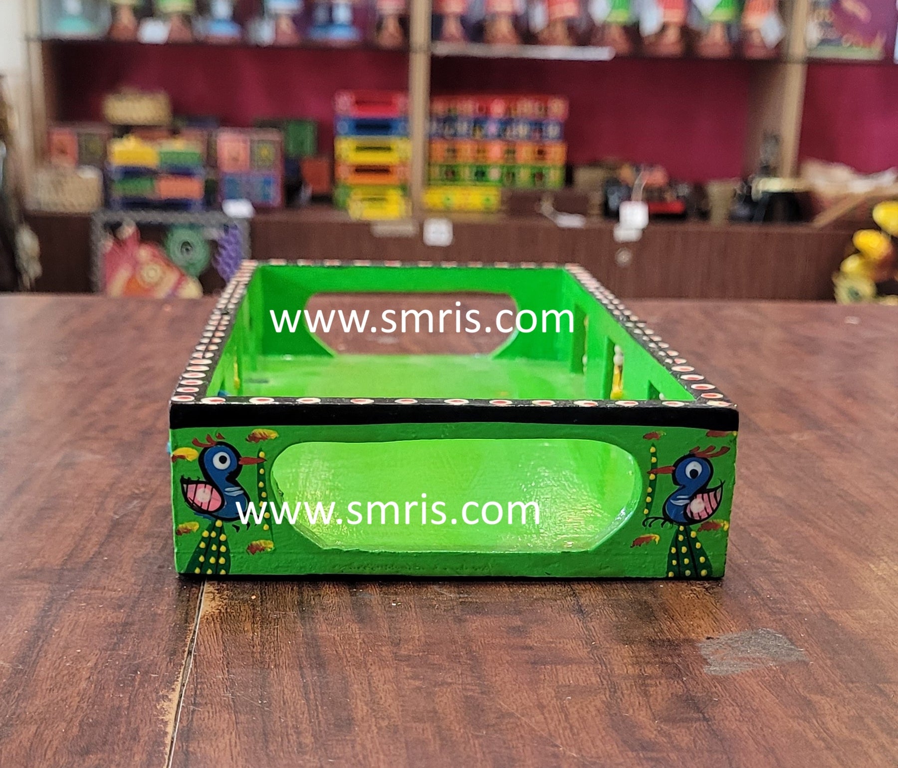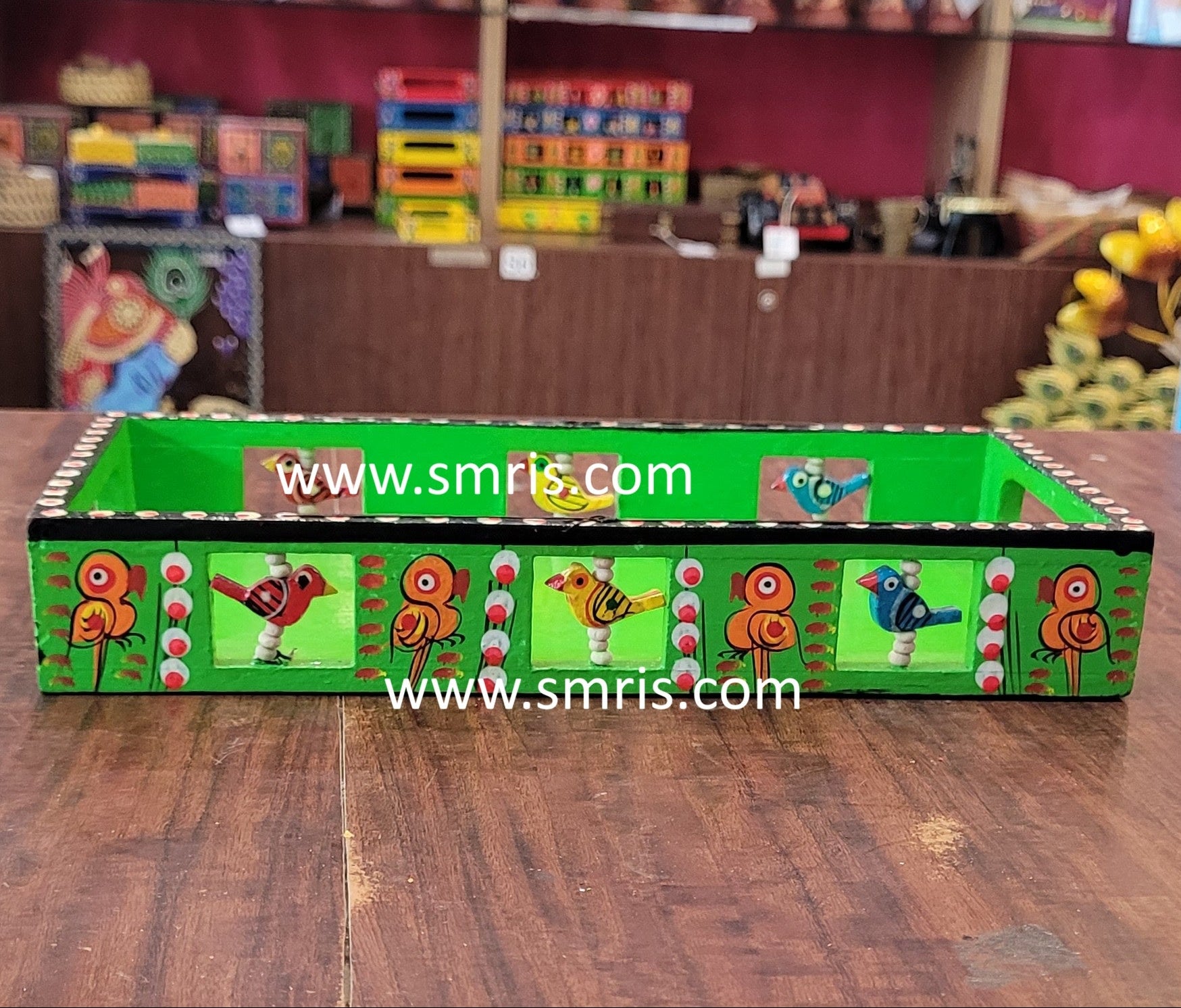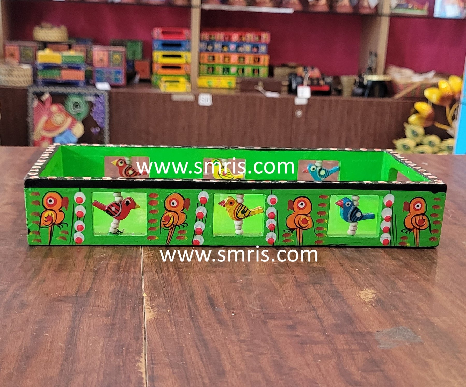Hand Crafted Wooden Serving Tray Green colour With Rotating Birds On The Sides small size indian handicrafts ( H-2 x L-10 x W-5 ) inches