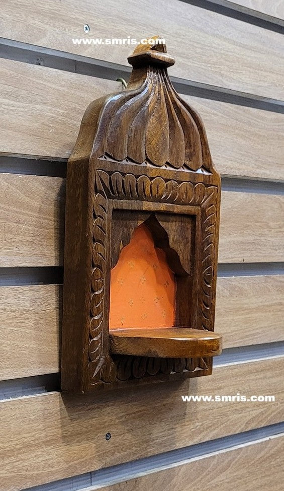 This elegant Jharokha-style wooden wall décor features intricate wood carving and a decorative vilakku maadam (lamp niche) design, making it a stunning statement piece for traditional Indian home décor and puja spaces.