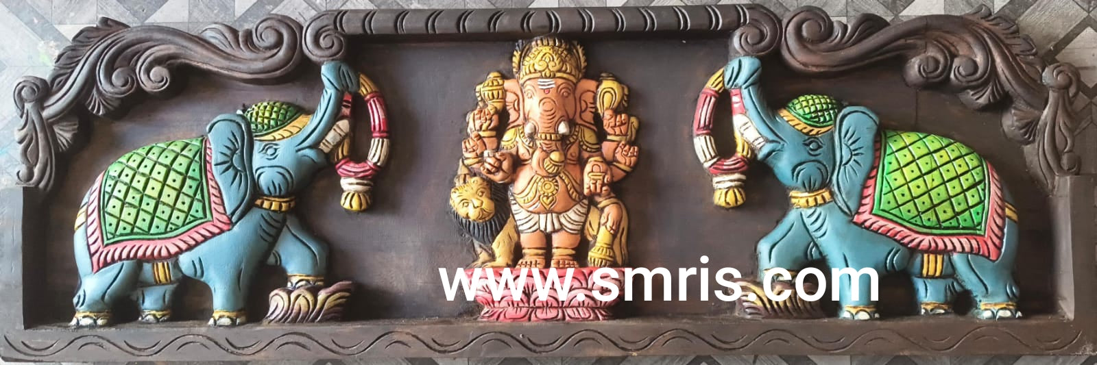 • Product Overview: The Drishti Ganesha Wooden Wall Panel is a handcrafted mahogany wood carving featuring Lord Ganesha flanked by a lion and double elephants. This powerful composition symbolizes protection from negative energy (Drishti), courage, strength, and prosperity, making it ideal for pooja rooms and entrance décor.